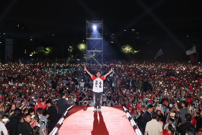 2일 오후 8시께 서울 중구 시청역 인근. 6·3 대선을 하루 앞둔 이날 이곳에는 김문수 국민의힘 대선후보의 마지막 유세 활동을 구경하려는 지지자들이 대거 모여들면서 북적이는 모습이 연출됐다. 시청 앞 광장은 마치 월드컵 경기 때처럼 발 디딜 틈이 없는 수준이었다.