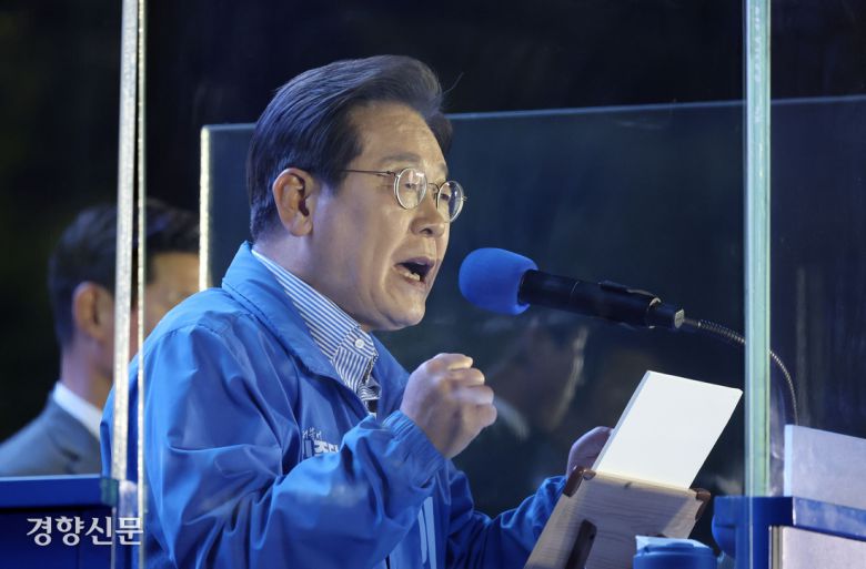 6·3 대선에 출마한 이재명 더불어민주당 후보가 2일 서울 여의도공원에서 마지막 유세를 하고 있다. 박민규 선임기자 |