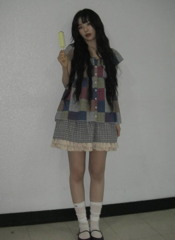 첫 번째 스타일에서 그는 아이스크림 '메로나'를 손에 든 채 빈티지한 패턴이 돋보이는 반소매 원피스를 착용해 러블리한 분위기를 자아냈다.