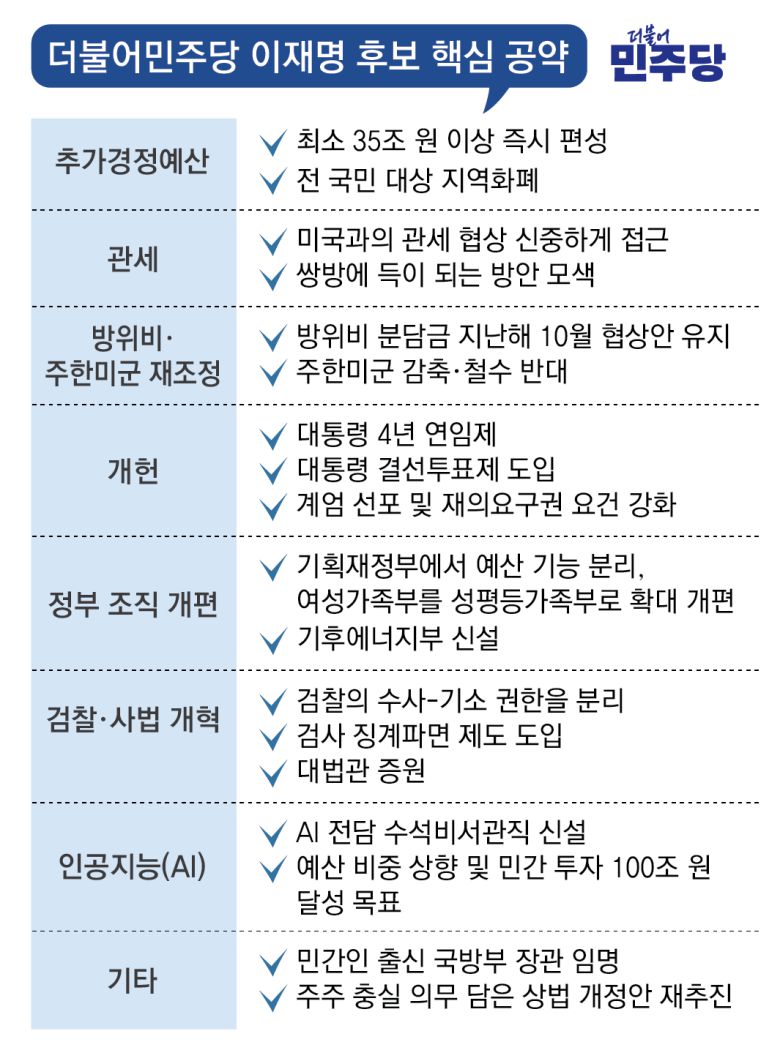 6·3 대선은 윤석열 전 대통령 파면, 즉 궐위에 따른 선거다. 준비 기간이 짧았던 탓에 정책공약집을 더불어민주당은 사전투표 하루 전, 국민의힘은 3일 전에 공개하는 등 ‘깜깜이 대선’이란 비판이 나왔다. 새 대통령 취임 후 국정 방향을 알 수 있는 밑그림인 대선 공약을 꼼꼼히 따져볼 필요성이 더욱 커진 것이다. 투표장에 가기 전 주요 공약과 핵심 이슈에 대한 각 후보들의 입장을 한눈에 볼 수 있도록 항목별로 정리했다.》