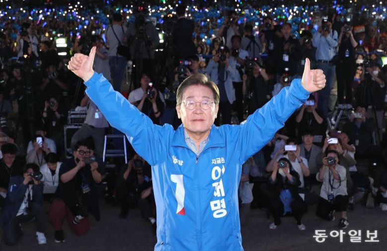 더불어민주당 이재명 대선 후보가 2일 서울 영등포구 여의도공원에서 열린 마지막 유세에서 양팔과 양 엄지손가락을 들어올리고 있다. 이 후보는 “여의도는 내란의 어둠을 빛으로 몰아낸 역사의 현장”이라며 “빛의 혁명이 시작됐던 이곳에서 빛의 혁명을 완수할 것”이라고 말했다. 이훈구 기자 ufo@donga.com |