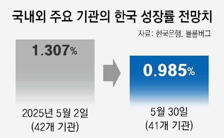 2일 한국은행에 따르면 지난달 30일 기준 블룸버그 조사 결과 국내외 41개 기관의 올해 한국 성장률 전망치 분포는 0.3∼2.2%, 평균 0.985%로 조사됐다. 지난달 2일 기준 조사 당시 42개 기관의 한국 성장률 전망치 평균(1.307%)과 비교하면 불과 4주 만에 0.322%포인트가 떨어진 셈이다.