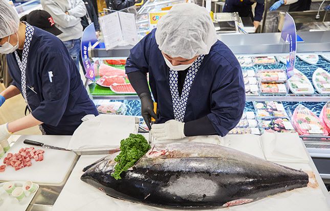 지난 4월 개점한 이마트 푸드마켓 고덕점. 수산 코너에서 대형 참치를 통째로 해체하는 ‘참치 해체쇼’가 열리고 있다. (사진=신세계그룹 뉴스룸)