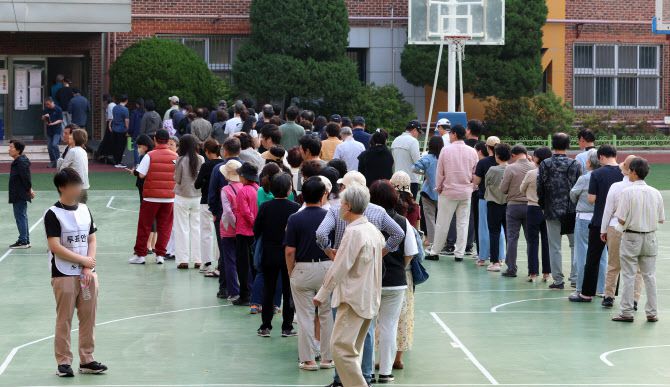 3일 오전 5시 30분, 이데일리가 찾은 서울 양천구 목동의 한 투표소 앞은 아직 투표가 시작되지 않은 시간임에도 사람들이 늘어섰다. 투표 시작시각인 오전 6시가 다가오자 수십명의 인파가 몰렸고, 이들이 만든 장사진은 건물 밖으로 나오기 시작했다.