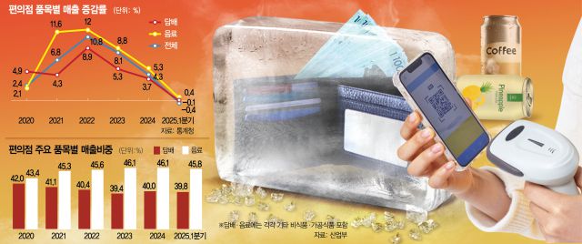 담배와 함께 편의점 매출의 또 다른 축인 음료도 비슷한 상황이다. 편의점의 음료 등 가공식품의 올해 1분기 매출 증가율은 전년 동기 대비 0.4%를 기록한 데 이어 4월에는 전년 동기 대비 -0.7%를 나타냈다. 2021~2023년 매분기 10% 이상 고성장하던 음료 매출이 지난해부터 한 자릿수로 주춤하더니 올 들어 아예 성장이 멈춘 것이다. 편의점 전체 매출 역시 올해 1분기 0.4% 감소하며 사상 처음으로 역성장했다.