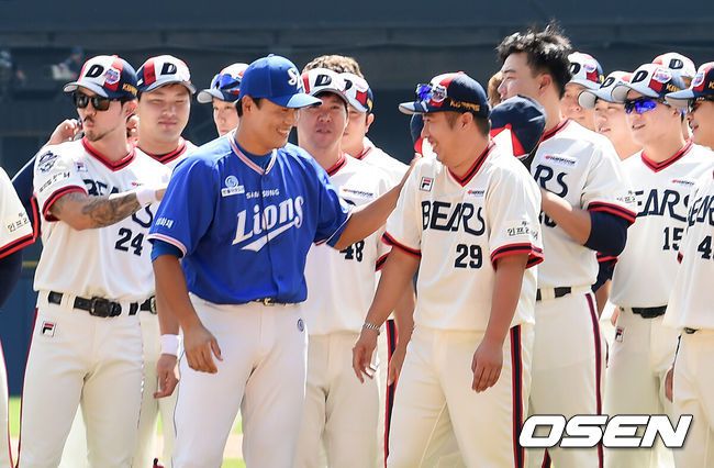 [OSEN=잠실, 지형준 기자] 3일 오후 서울 잠실야구장에서 열린 '2017 타이어뱅크 KBO리그' 두산 베어스와 삼성 라이온즈의 경기, 삼성 이승엽이 두산전 은퇴투어 행사에서 두산 선수들이 기념 촬영을 하고 있다. /jpnews@osen.co.kr
