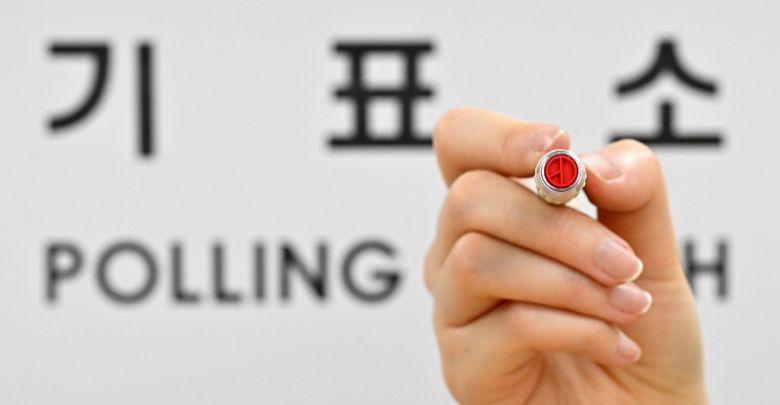 제21대 대통령 선거를 하루 앞둔 2일 서울 용산구 청파도서관에 마련된 청파동 제1투표소에서 관계자가 기표 도장을 들어 보이고 있다. [공동취재단] |