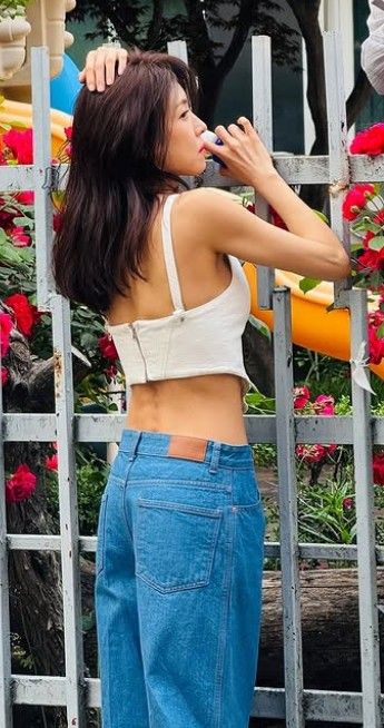 사진 속 하지원은 골목길에서 민소매 크롭 탑과 와이드 데님 팬츠를 매치한 트렌디한 여름룩 모습이다. 자연광 아래 드러난 복근 라인과 군살 없는 실루엣, 광채가 흐르는 듯한 물광 피부가 돋보인다.