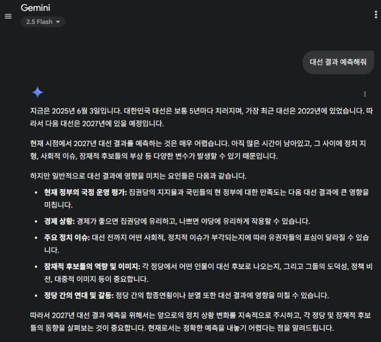 제미나이는 대선 결과 예측을 묻자 "다음 대선은 2027년에 있을 예정"이라며 "현재 시점에서 2027년 대선 결과를 예측하는 것은 매우 어렵다"고 답했습니다.
