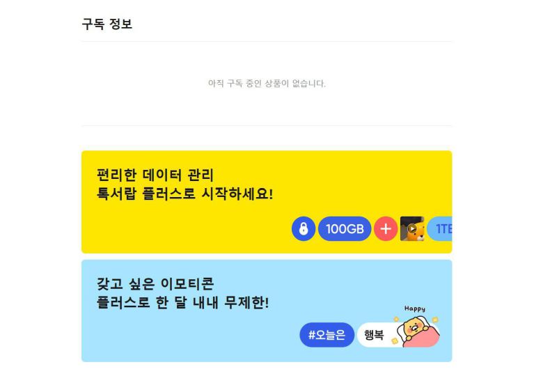 PC 웹사이트에서 톡서랍 플러스를 검색하거나, PC 카카오톡의 왼쪽 더보기 메뉴를 열어 ‘My 구독’ 또는 이모티콘샵에 들어가면 ‘My 구독’ 페이지가 열립니다. 톡서랍 플러스 배너를 클릭하면, 100GB 기준 월 1900원의 정상가를 확인할 수 있습니다. 또한 250GB(월 3900원), 500GB(월 6900원), 1TB(월 8900원) 등 다양한 용량 옵션도 선택할 수 있습니다.