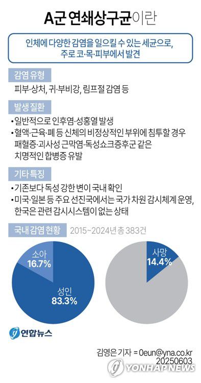 (서울=연합뉴스) 서한기 기자 = 최근 해외에서 급증하며 공중 보건을 위협하는 'A군 연쇄상구균' 감염에 대한 공포가 국내에도 엄습하고 있다.