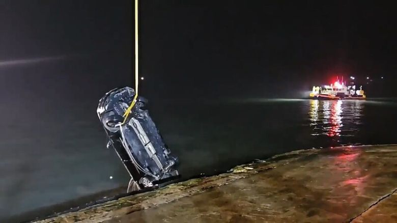 2일 밤 전남 진도군 진도항 인근 바다에서 일가족이 탄 차량을 해경이 인양하고 있다. 목포해경 제공 |