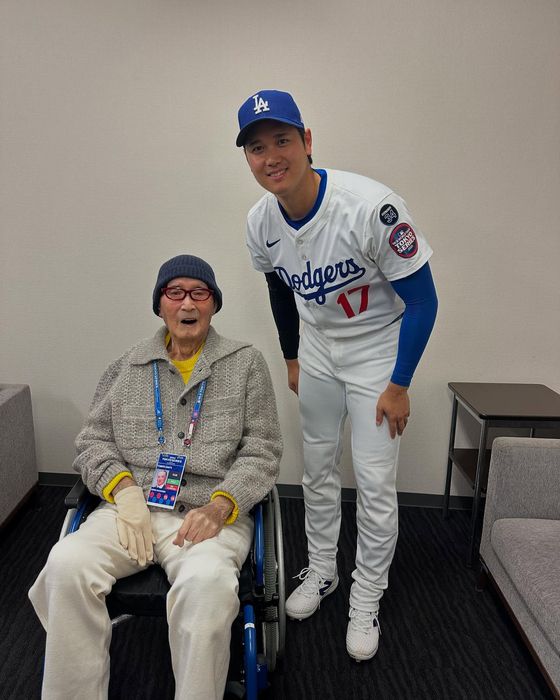 지난 3월 열린 MLB 도쿄시리즈에서 오타니 쇼헤이(오른쪽)가 나가시마 시게오 요미우리 종신 명예감독과 이야기를 나눈 뒤 사진을 찍고 있다. 사진 오타니 쇼헤이 인스타그램 |