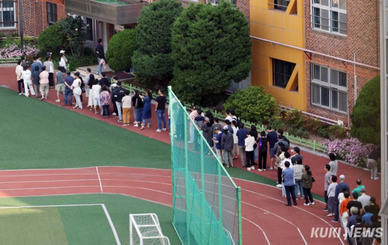 제21대 대통령 선거일인 3일 서울 용마초등학교 내에 설치된 중곡2동 제4투표소에서 유권자들이 소중한 한표를 행사하기 위해 줄지어 서있다. |