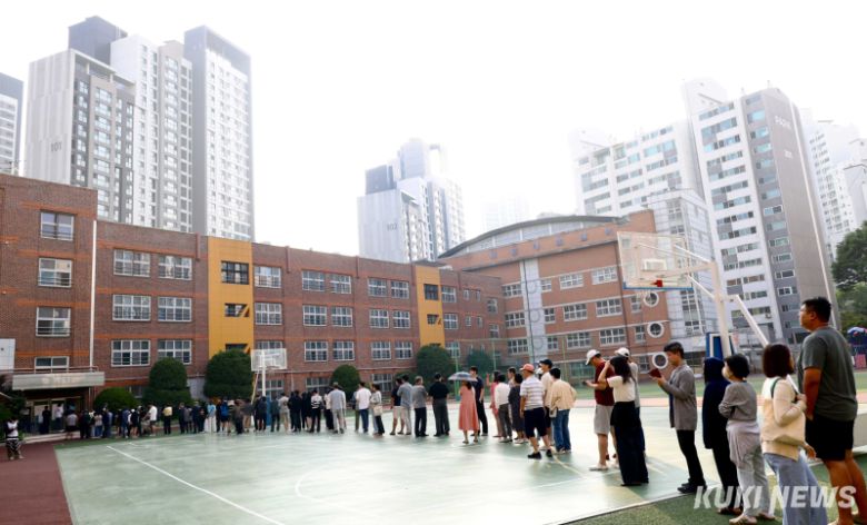 투표 개시 시각인 오전 6시부터 수십 명의 주민이 이미 대기 중이었고, 운동장 트랙을 따라 50여 미터에 달하는 줄이 길게 늘어섰다. 대기줄에는 유모차를 끌고 온 젊은 부부, 안면이 익은 이웃들과 인사를 나누는 주민들, 투표 안내문을 확인하는 유권자들이 어우러져 차분하면서도 활기찬 분위기를 띄었다.