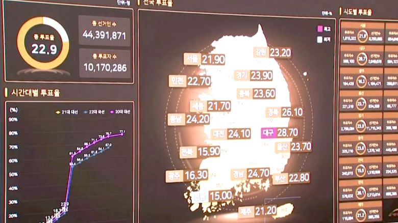 제 옆에 보이는 모니터에는 이렇게 매시간 집계되는 투표율이 표시됩니다.
