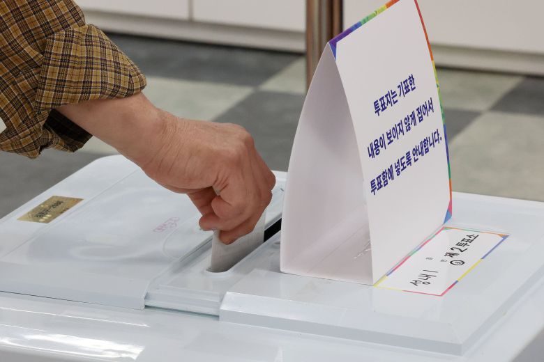 제21대 대통령 선거일인 3일 서울 강동구 성내중학교 과학실험실에 마련된 성내1동 제2투표소에서 한 유권자가 투표하고 있다./뉴스1 제공 |