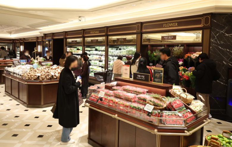 신세계백화점이 식품관 내 슈퍼마켓을 '신세계 마켓'으로 재개장한 28일 서울 서초구 신세계백화점 강남점에서 시민들이 장을 보고 있다. 신세계 마켓은 신선식품 매장, 프리미엄 가정식 전문관, 그로서리(식료품) 매장 등 세 구역으로 이뤄졌다. 2025.02.28.뉴시스 |