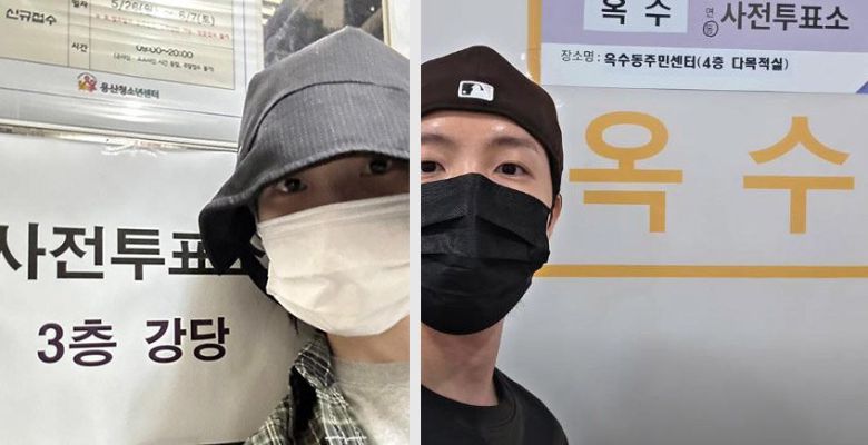‘카리나 효과’? 아이유·제이홉 무채색옷 입고 투표 인증샷…‘엄지척’ ‘V’도 지양