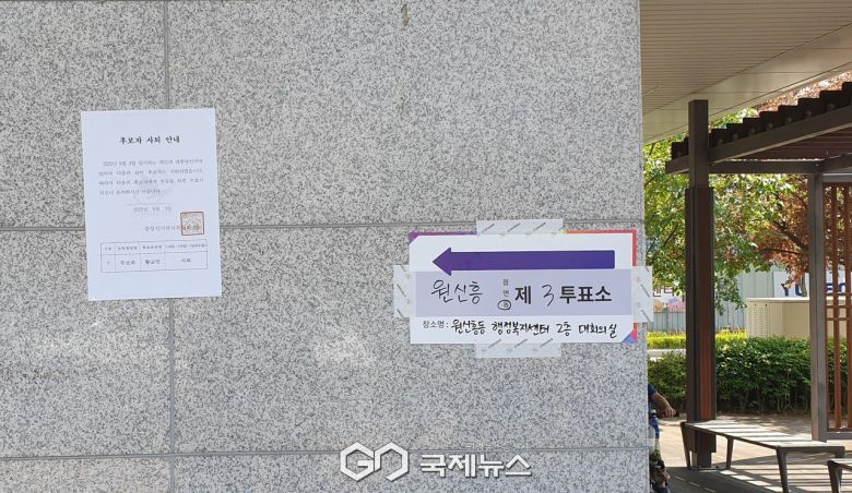 (대전=국제뉴스) 김태수 기자 = 제21대 대통령선거에 후보자로 등록 했던 무소속 황교안 후보가 지난 2일 자진 사퇴 함에 따라 3일 실시된 제21대 대통령 선거 투표소 입구에는 기호 7번 황교안 후보에게 투표하면 '무효'라는 안내문이 게시 되어있다.