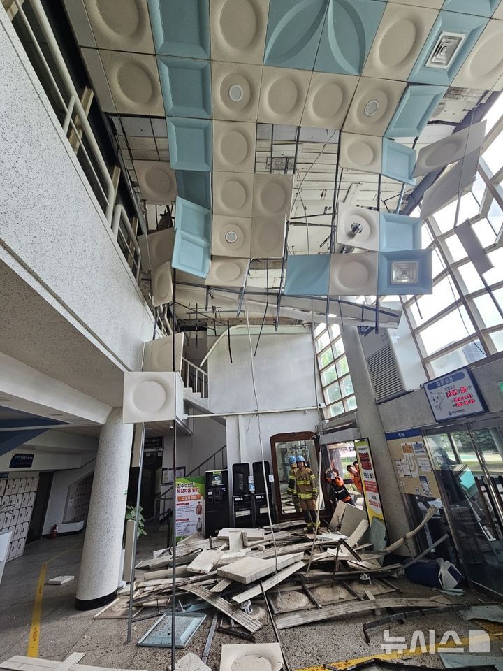 [청주=뉴시스] 3일 충북 청주실내수영장 로비 천장 일부가 무너졌다. (사진= 청주서부소방서 제공) 2025.06.03. photo@newsis.com *재판매 및 DB 금지