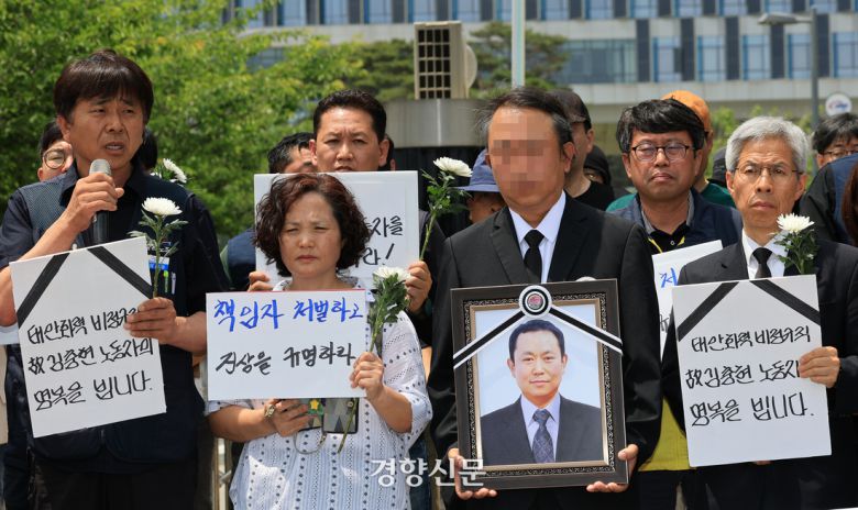 ‘태안화력 김충현 비정규직 노동자 사망사고 대책위원회’ 소속 노동자들과 유족이 3일 충남 태안군 한국서부발전 본사 앞에서 진상규명을 요구하며 기자회견을 하고 있다. 2025.06.03 서성일 선임기자 |