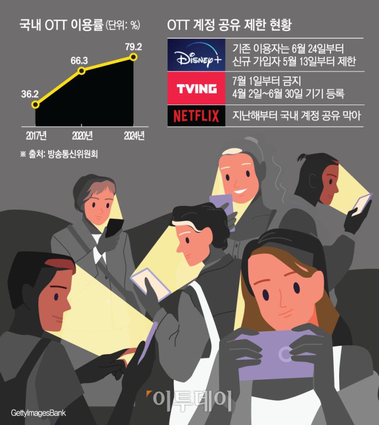 온라인동영상서비스(OTT) 업체들이 국내 이용자들의 계정 공유를 금지하고 나섰다. 콘텐츠 제작비는 천정부지로 오르는 반면 포화상태에 이른 OTT 시장은 새로운 가입자를 유치하기 어려워 수익성 확보에 비상등이 켜진 영향으로 풀이된다.