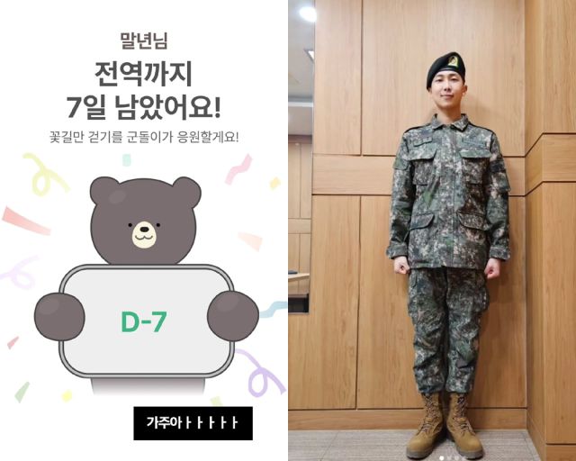 RM은 3일 자정에 "가주아ㅏㅏㅏㅏㅏ"라는 문구와 함께 "말년님, 전역까지 7일 남았어요! 꽃길만 걷기를 군돌이가 응원할게요"라는 문구가 담긴 군 복무 일정 앱 '군돌이'의 화면 사진을 게시했다.