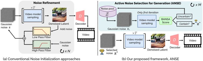 핵심 기술은 BANSA(Bayesian Active Noise Selection via Attention)로, 비디오 생성 초기에 진행되는 노이즈 제거 과정에서 어텐션 맵을 기반으로 모델의 불확실성을 측정, 더 정확하고 일관된 결과물을 얻을 수 있도록 돕는다.