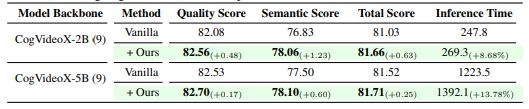 실험 결과, 코그비디오X-2B 모델에서는 ANSE 적용 시 전체 V벤치(VBench) 점수가 81.03에서 81.66으로 0.63점 상승했으며, 의미 일치(semantic alignment)는 +1.23점 향상됐다.