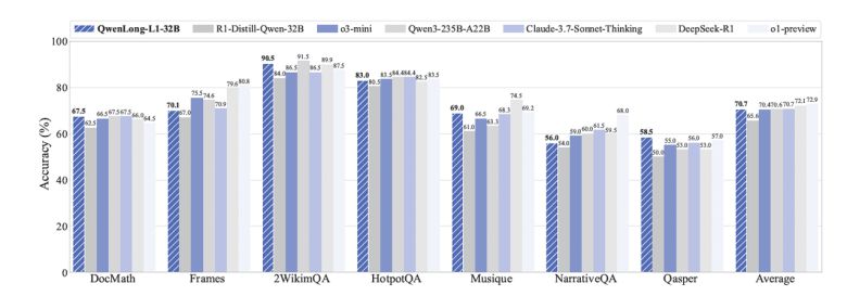 그 결과, '큐원롱-L1-32B' 모델은 앤트로픽의 '클로드 3.7 소네트 싱킹'과 비슷한 성능을 기록했으며, 오픈AI의 'o3-미니', 알리바바의 '큐원3-235B-A22B' 등보다 뛰어난 결과를 보였다.