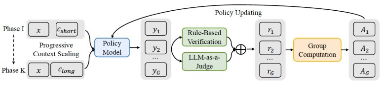 두번째 단계는 '커리큘럼 기반 단계적 RL'이다. 모델이 점진적으로 더 긴 입력을 다루도록 훈련 범위를 넓혀간다. 짧은 컨텍스트에서 습득한 추론 전략을 길어진 컨텍스트에 자연스럽게 확장하도록 유도, 학습의 불안정성과 비효율성을 최소화한다는 의도다.