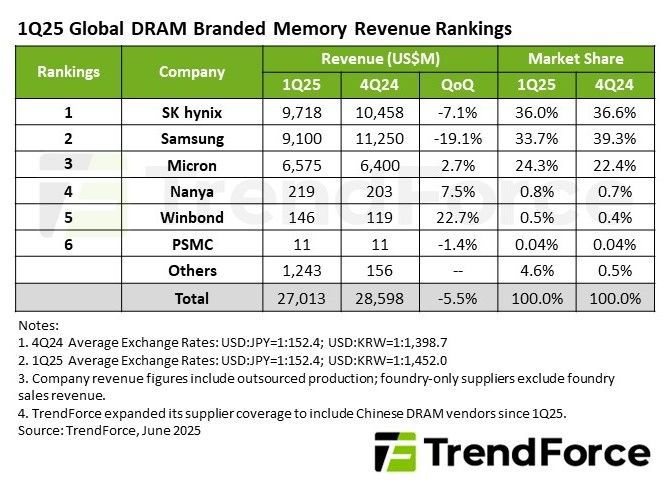 삼성전자는 91억달러 매출로 2위(33.7%)를 차지했다. 전 분기 대비 매출이 19.1% 감소한 것으로, 주로 HBM 출하 감소 영향이다. 중국에 HBM 제품을 직접 판매하지 못했고, 제품 재설계 이후 고가 HBM3E의 출하량이 크게 줄었다.