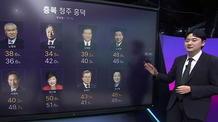 터치분석실입니다. 여러분 역대 대통령 선거에서 어떤 후보에게 투표하셨나요. 여러분이 투표한 후보가 언제나 당선이 되셨을까요. 지금 보시는 여기 6개가 13대 대통령 선거, 직선제가 시작된 13대 대선부터 20대까지 8번의 대통령 당선인을 모두 마친 지역입니다. 이 지역에서 득표율 1위를 한 후보가 언제나 대통령이 되었는데요. 이 선거에서 6번 연속 대통령을 맞춘 지역은 16곳이었는데, 7번 연속 맞힌 지역은 15곳으로 줄었고요, 이렇게 8번 연속 맞힌 지역은 6곳까지 압축됐습니다.