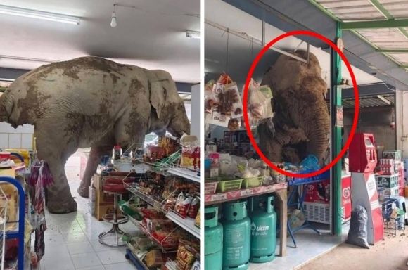 태국에서 거대한 야생 코끼리가 편의점에 들이닥쳐 음식을 훔쳐먹고 달아나는 일이 발생했다.