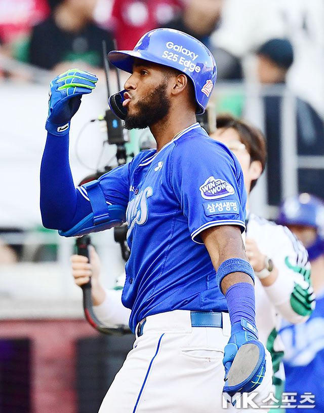 6회초 1사 2루에서 삼성 디아즈가 시즌 22호 추격의 투런홈런을 치고 더그아웃으로 향하면서 세리머니를 하고 있다.
