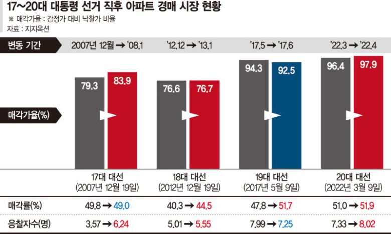 지지옥션에 따르면 지난 17대 대선의 경우 선거가 치러진 2007년 12월 79.3%였던 전국 아파트 경매 매각가율(감정가 대비 낙찰가 비율)은 한달 뒤인 2008년 1월 83.90%로 치솟았다. 응찰자수 역시 같은 기간 3.57명에서 6.24명으로 대폭 늘었다. 당시 이명박 한나라당 후보가 2등 후보와 역대 최대 격차로 당선되면서, 교체된 정권과 새로운 정책 방향에 대한 기대감이 반영된 것으로 풀이된다.