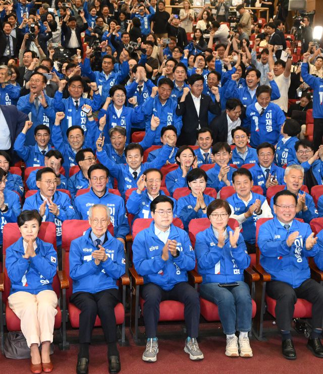 더불어민주당 총괄선거대책위원회 및 의원, 당직자들이 3일 서울 여의도 의원회관 대회의실에서 ‘제21대 대통령선거’ 개표방송을 시청하며 지상파 3사 출구조사가 이재명 민주당 후보의 우세로 발표되는 순간 환호하고 있다. 오승현 기자 2025.06.03