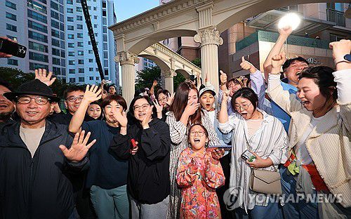 (인천=연합뉴스) 임순석 기자 = 제21대 대통령 선거일인 3일 오후 더불어민주당 이재명 후보의 자택인 인천 계양구 아파트 주민들이 핸드폰으로 방송사 출구조사 결과를 보며 환호하고 있다. 2025.6.3