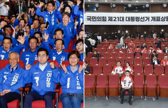 3일 KBS·MBC·SBS 등 지상파 방송 3사가 발표한 21대 대선 공동 출구 조사에서 이재명 더불어민주당 후보가 51.7%, 김문수 국민의힘 후보가 39.3%를 득표할 것으로 예측되자 (왼쪽) 서울 여의도 국회의원회관 개표상황실에서 이를 지켜본 박찬대, 윤여준 민주당 상임총괄선대위원장 등이 손뼉치고 있다. (오른쪽) 같은 시각 국회 도서관에 마련된 국민의힘 개표 상황실에서 출구조사를 본 김용태 비상대책위원장이 자리를 떠나고, 안철수 공동선대위원장 혼자 굳은 표정으로 자리를 지키고 있다. 2025.6.3 홍윤기 기자