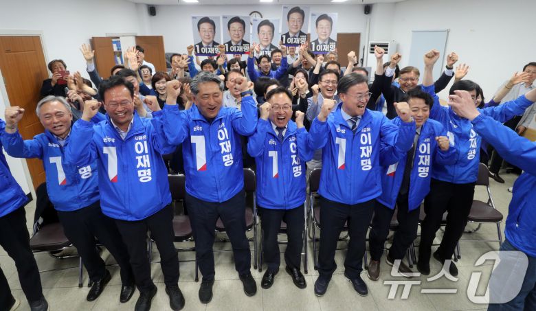 출구조사 결과 발표를 함께 지켜본 당직자들과 지지자 등도 박수와 함께 환호했고 '이재명'을 연호하는 함성이 이어지며 분위기는 더욱 고조됐다.