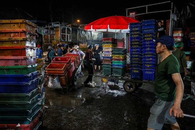 베트남 하노이의 롱비엔 시장에서 사람들이 트럭에서 과일을 싣기 위해 상자를 옮기고 있다. [사진=로이터·연합뉴스]