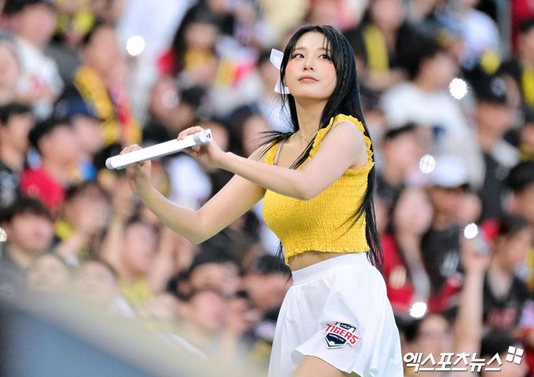 (엑스포츠뉴스 잠실, 김한준 기자) 3일 오후 서울 송파구 잠실야구장에서 열린 '2025 신한 SOL Bank KBO리그' KIA 타이거즈와 두산 베어스의 경기, KIA유세빈 치어리더가 열띤 응원을 선보이고 있다.