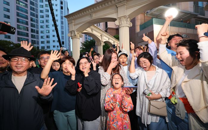 제21대 대통령 선거일인 3일 오후 더불어민주당 이재명 후보의 자택인 인천 계양구 한 아파트에서 주민들이 출구조사 결과를 확인한 뒤 이재명 후보 당선을 응원하고 있다. [사진 = 연합뉴스] |