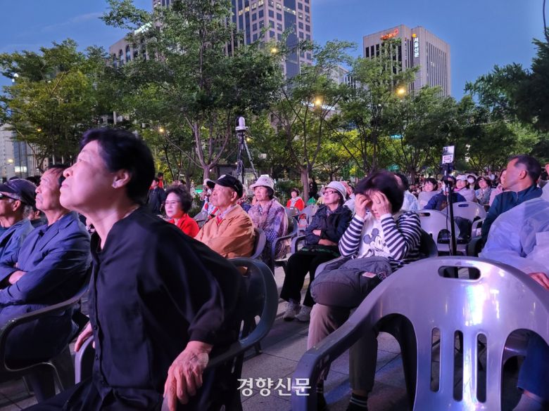 김문수 국민의힘 대선 후보 지지자들이 3일 서울 종로구 동화면세점 앞 ‘대한민국 바로 세우기 운동본부’가 주최한 집회에서 대선 개표 방송을 보고 있다. 백민정 기자