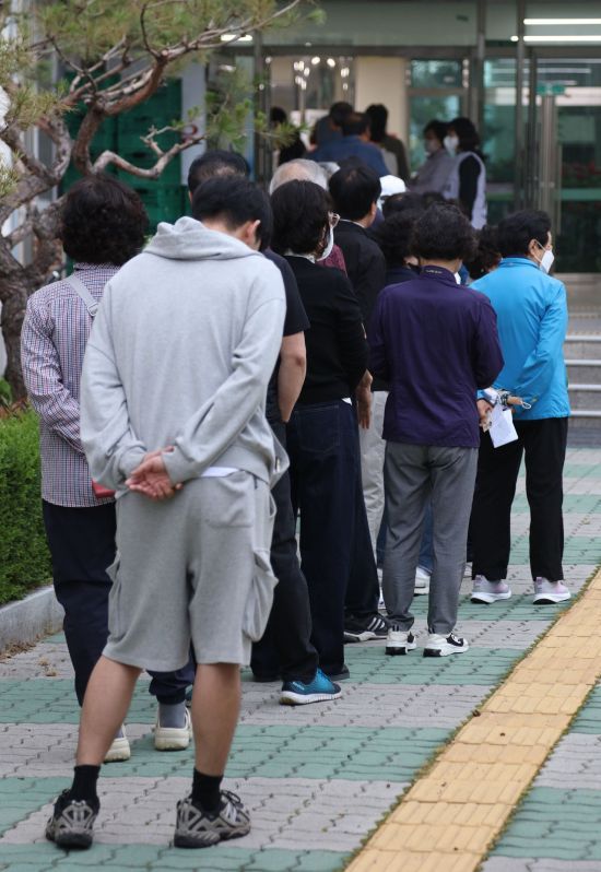 시민들이 제21대 대통령 선거 투표일인 3일 오전 투표소에서 줄지어 투표를 기다리고 있다. 연합뉴스