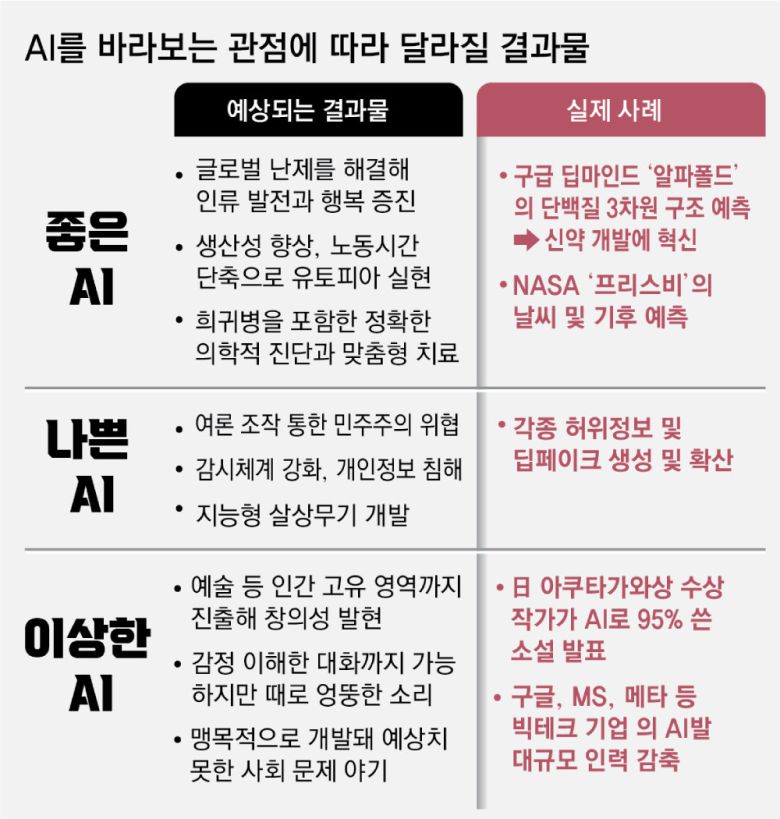 영화 속 ‘좋은 놈’처럼 ‘좋은 AI’는 인류의 삶을 개선할 것이라는 희망을 품게 한다. 예컨대 의료 분야에서는 정확한 진단과 맞춤형 치료법을 제시해 희귀병을 조기에 발견하게 하고, 교육에서는 맞춤형 교육을 가능하게 한다. 기후변화와 같은 글로벌 문제 해결에도 AI의 역할이 크게 기대된다. 이런 좋은 AI는 과학기술 진보의 정점이자 공공선을 위한 힘으로서 인류의 행복을 증진시키고, 사회 전반에 긍정적인 변화를 가져올 수 있다. 정신노동의 자동화로 ‘주 1일 근무’ 시대가 온다면, AI는 유토피아 사회를 가능케 할 핵심 동력이 될 수도 있다.