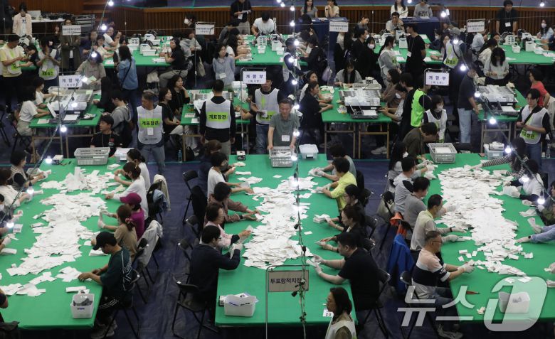 제21대 대통령 선거 투표가 종료된 3일 오후 부산 남구 국립부경대학교 대연캠퍼스 체육관에 마련된 개표소에서 개표사무원들이 투표지 분류 작업을 하고 있다. 2025.6.3/뉴스1 ⓒ News1 윤일지 기자 |