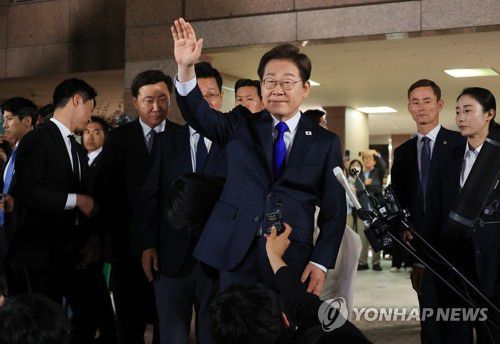 자택에서 나오는 이재명 후보(인천=연합뉴스) 최재구 기자 = 제21대 대통령 선거에서 당선이 확실시되는 더불어민주당 이재명 후보가 3일 밤 인천 계양구 자택을 나서며 주민과 지지자들을 향해 인사하고 있다. 2025.6.3 jjaeck9@yna.co.kr