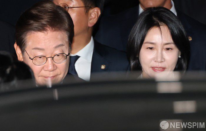 [인천=뉴스핌] 김학선 기자 = 제21대 대통령 선거에서 당선이 확실시 되는 이재명 더불어민주당 대선 후보와 부인 김혜경 여사가 3일 밤 인천 계양구 귤현동 자택을 나와 차에 타고 있다. 2025.06.03 yooksa@newspim.com